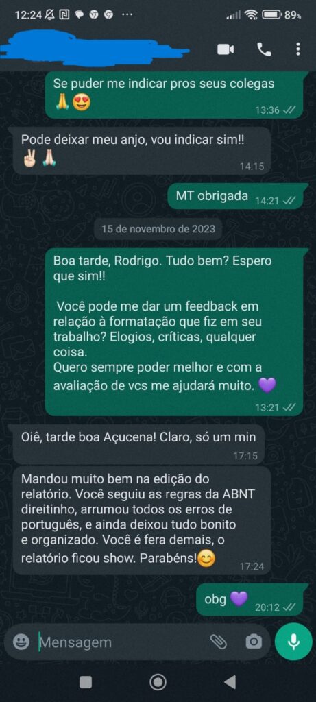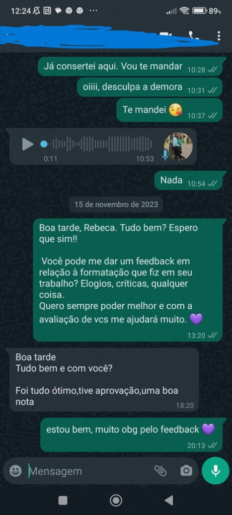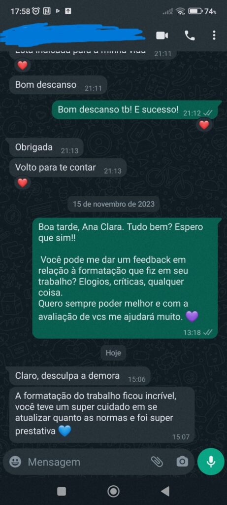 Eu sei que você precisa focar nos seus estudos ou simplesmente tirar alguns dias para descansar. Então, chega de ter que se preocupar com suas normalizações acadêmicas. Você não precisa se preocupar, faça seu orçamento e deixe todo o trabalho comigo. Seu trabalho todo colocado no melhor formato exigido pelo meio acadêmico nos dias atuais.